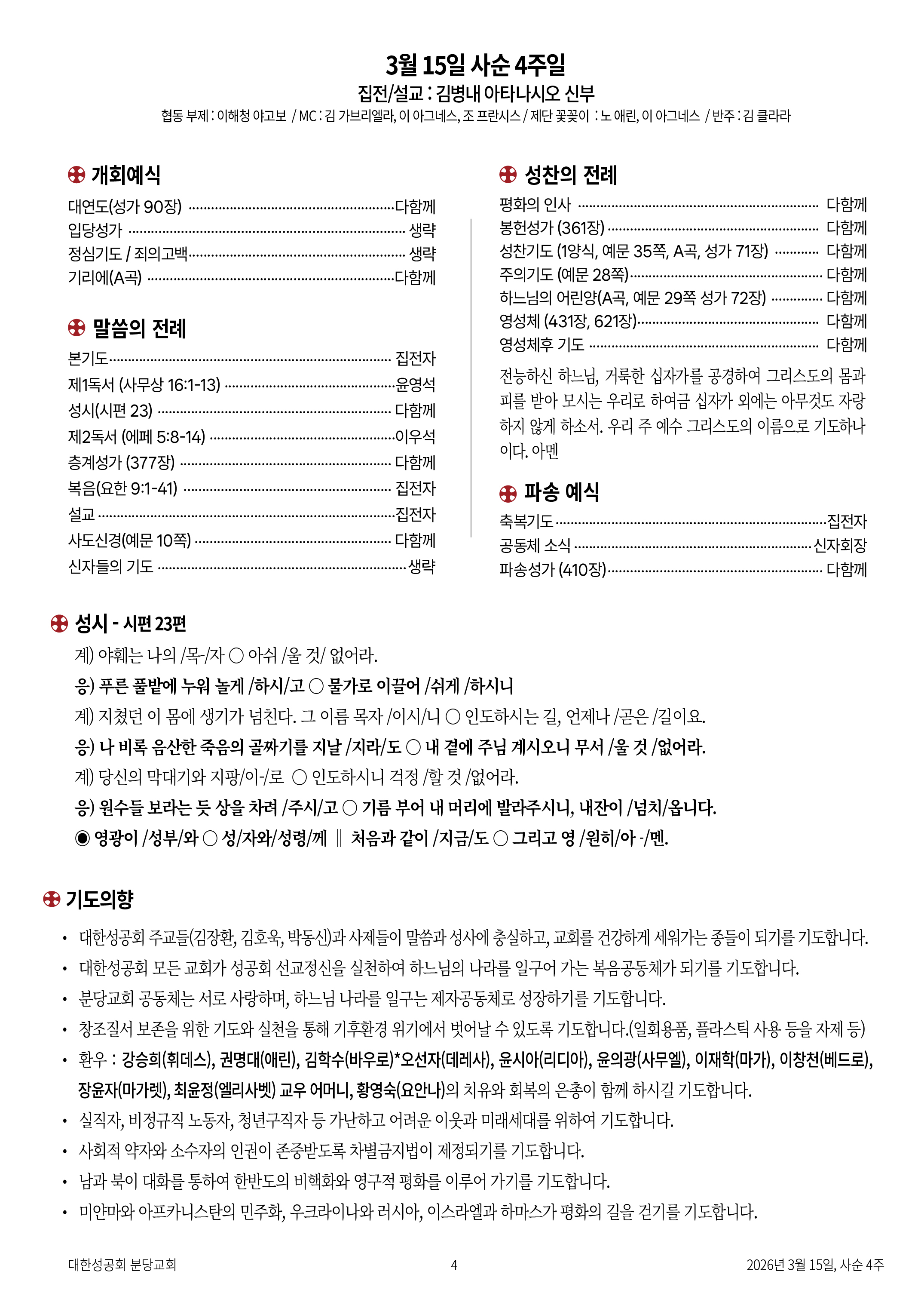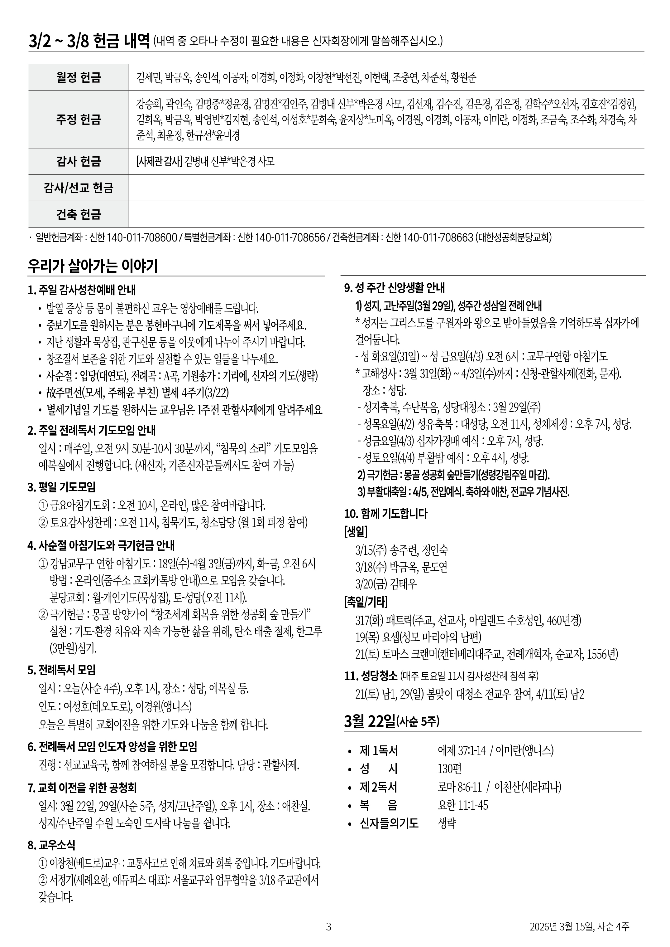 교회 주보 사순 4주 by 분당교회 2026. 3. 15. 2026년 3월 15일 사순 4주 공유하기 게시글 관리 대한성공회 분당교회 '교회 주보' 카테고리의 다른 글 사순 3주 (0) 2026.03.09 사순 2주일 (0) 2026.03.02 사순 1주 (0) 2026.02.22 연중 6주일 (0) 2026.02.15 연중 5주일 (0) 2026.02.09 관련글 사순 3주 사순 2주일 사순 1주 연중 6주일 댓글