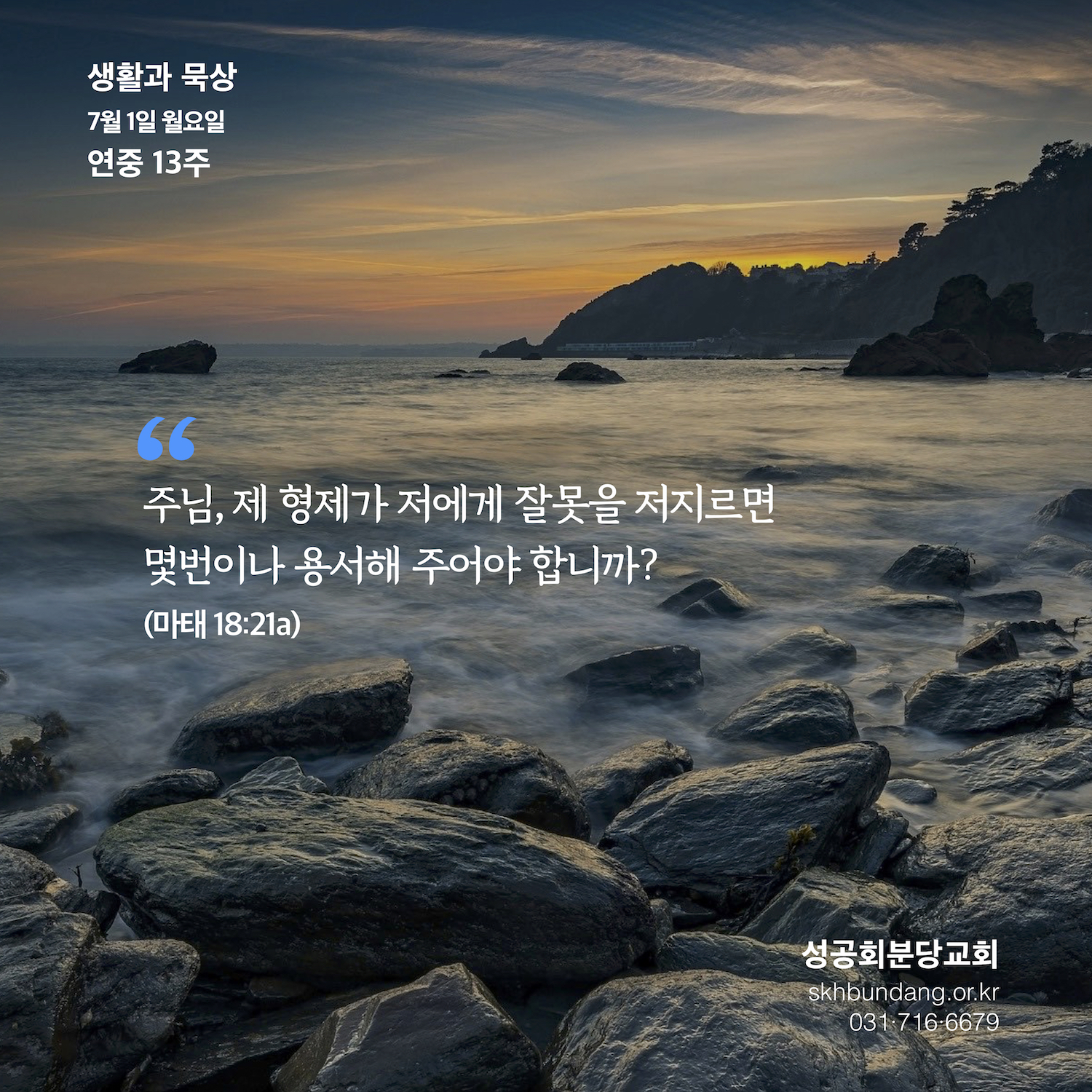 용서란 우리가 기독교인이라는 것을 보여주는 위대한 무기입니다. 하지만 그 용서가 '참'되기 위해서는 먼저 자기 자신을 용서하는 과정이 필요합니다. 사람들에게는 저마다 내면 깊은 곳에서 울고 있는 4살짜리 어린아이가 있습니다. 기도 가운데 우리의 가슴 깊은 곳에서 울고 있는 또 다른 자신을 만나서 안아주는 것. 이것이 누군가를 용서하는 것보다 때로는 더 어렵습니다. 마치 '일곱 번씩 일흔 번'을 용서하는 것처럼 불가능해 보이기도 합니다.