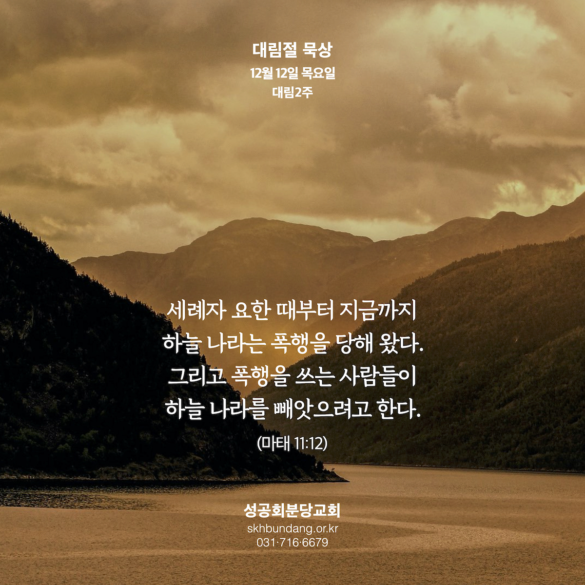 12 “세례자 요한 때부터 지금까지 하늘 나라는 폭행을 당해 왔다. 그리고 폭행을 쓰는 사람들이 하늘 나라를 빼앗으려고 한다.