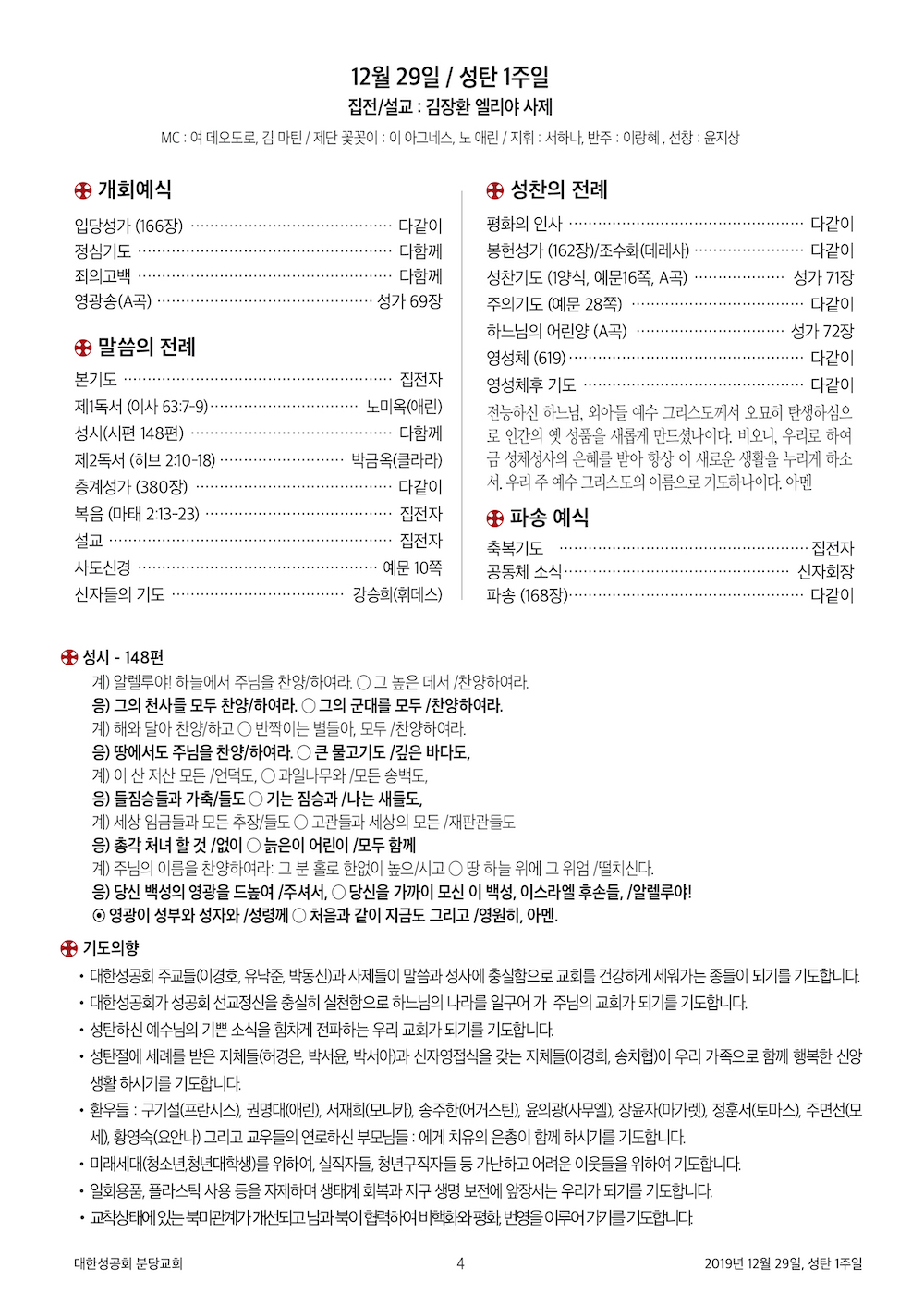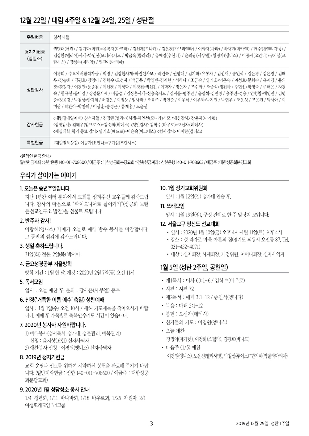 2019년 12월 29일, 성탄 1주일(송년주일)