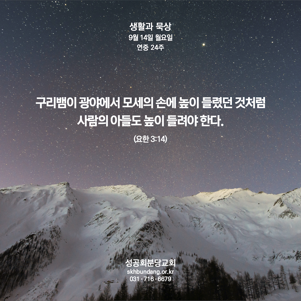 14 구리뱀이 광야에서 모세의 손에 높이 들렸던 것처럼 사람의 아들도 높이 들려야 한다.