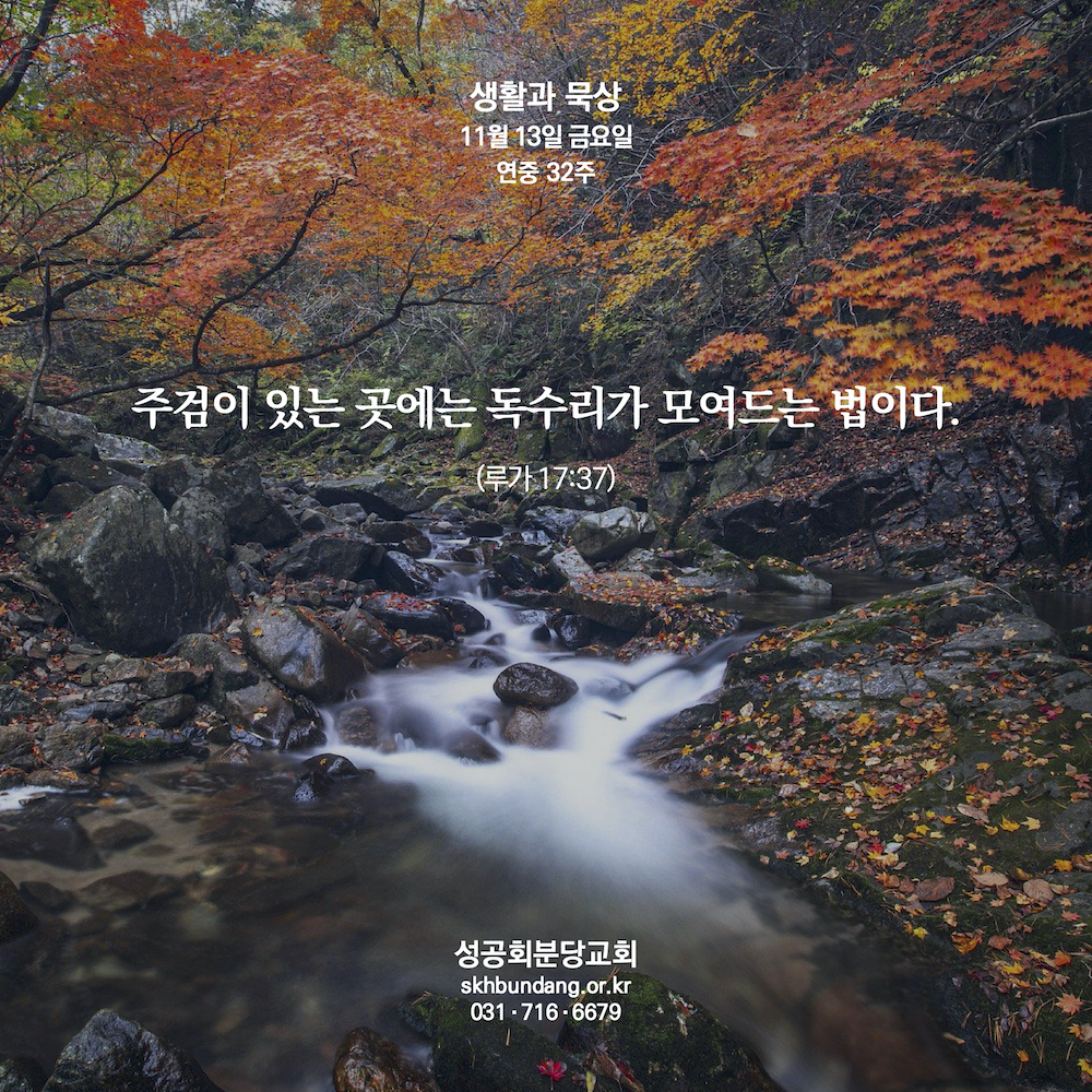 주검이 있는 곳에 독수리가 모여드는 법이라 하신 말씀이 어려워 한참을 묵상하였습니다. 주검은 그 앞에 말씀하신 제 목숨을 잃는 자, 독수리는 목숨을 잃은 자에게 주시는 영원한 생명이란 마음이 들었습니다. 사람이 살아가는 곳에는 노아와 롯의 때처럼 늘 죄와 어둠이 있겠고 그 안에서 마음과 영혼의 아픔과 방황이 있겠지만 자신을 내려놓고 주검이 되는 길이 곧 제가 사는 길인 것 같습니다. 알 수 없는 그 어느 날이 아닌 지금을 살아가는 바로 여기, 제 마음 가운데에서 날마다 사람의 아들 그분을 만날 수 있기를 소망합니다.